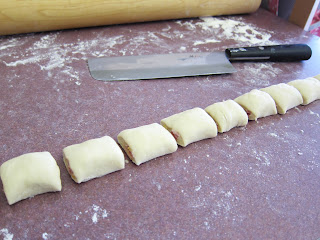 4. Turn out dough onto a lightly floured surface and cut into 4 equal pieces. Lightly dust your hands with flour, then gently roll and stretch 1 piece of dough to form a 12-inch-long rope. Flatten dough and arrange so a long side is nearest you, then roll out to a roughly 12- by 4-inch rectangle with a lightly floured rolling pin. Gently press one fourth of ham and cheese into lower third of rectangle, leaving a 1/2-inch border along bottom edge. Stretch bottom edge of dough up over filling and press tightly to seal, then roll up as tightly as possible to form a rope. Cut rope into 12 pieces and transfer to a sheet pan (leave about an inch between pieces, the dough will rise slightly). Repeat with remaining dough, ham, and cheese. Let rest at room temperature, uncovered, for 30 minutes.