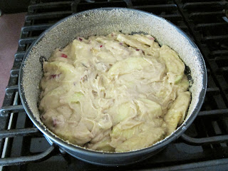 4.      Using an electric mixer fitted with a paddle attachment, beat the butter and remaining sugar together until light and fluffy, about 2 minutes. Add the egg and mix until combined. On low speed, add the flour and baking powder. Slowly add the half-and-half. Add apple and rhubarb then fold in well.